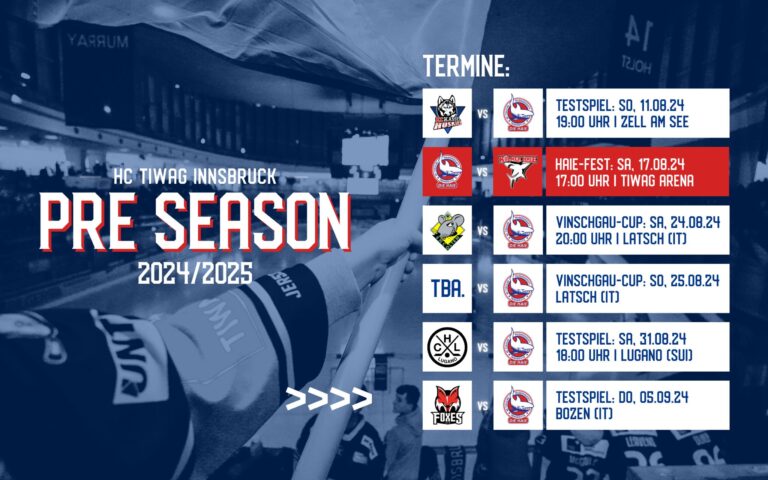 Insgesamt stehen für die Haie sechs Testspiele auf dem Programm. Den Beginn macht das Aufeinandertreffen mit den Kassel Huskies aus der DEL2 in Zell am See am 11. August. Sechs Tage später folgt das Highlight der diesjährigen Pre-Season. Beim traditionellen Haie-Fest gastieren die Kölner Haie aus der DEL in der TIWAG Arena. Mit einem bunten Rahmenprogramm wird gleichzeitig 30 Jahre HCI gefeiert.