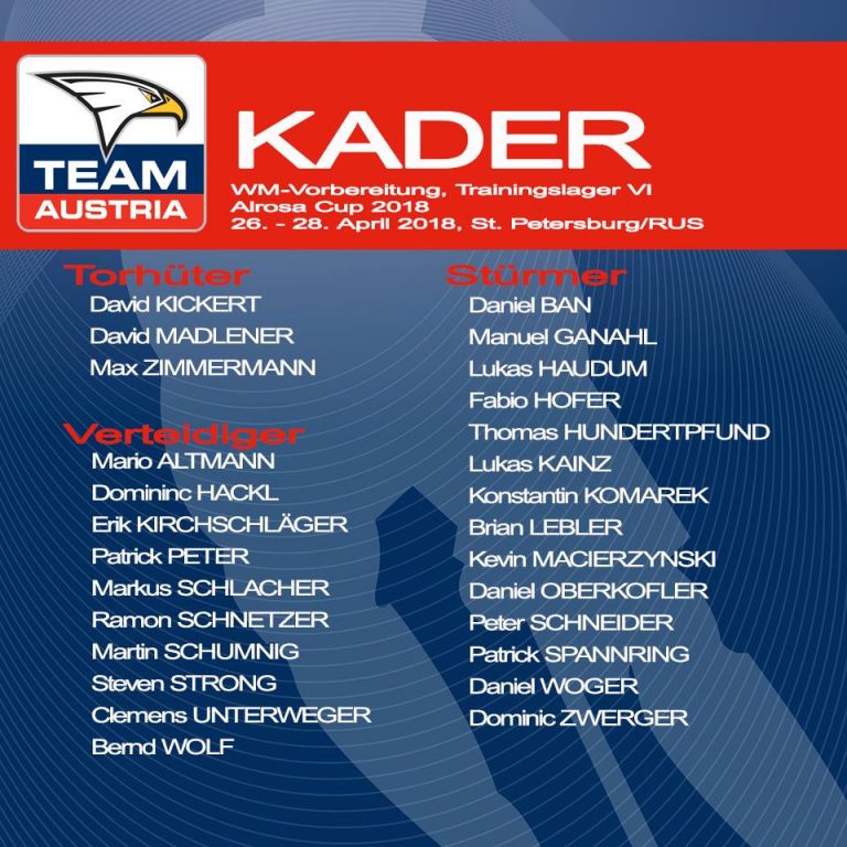 Ebenso noch im Talon hat Bader die Legionäre Stefan Ulmer und Patrick Obrist. Wenn das Team am Mittwoch nach St. Petersburg fliegt um beim abschließende Turnier gegen die U25 von Norwegen und Weißrussland sowie die zweite Garnitur der Russen zu testen, wird es zuvor am morgigen Dienstag noch einen Cut geben. Von den aktuell 33 Cracks (Kader im Bild inklusive der Salzburger Starkbaum, Viveiros, Heinrich, Cijan, Rauchenwald und Huber) müssen fünf zuhause bleiben.